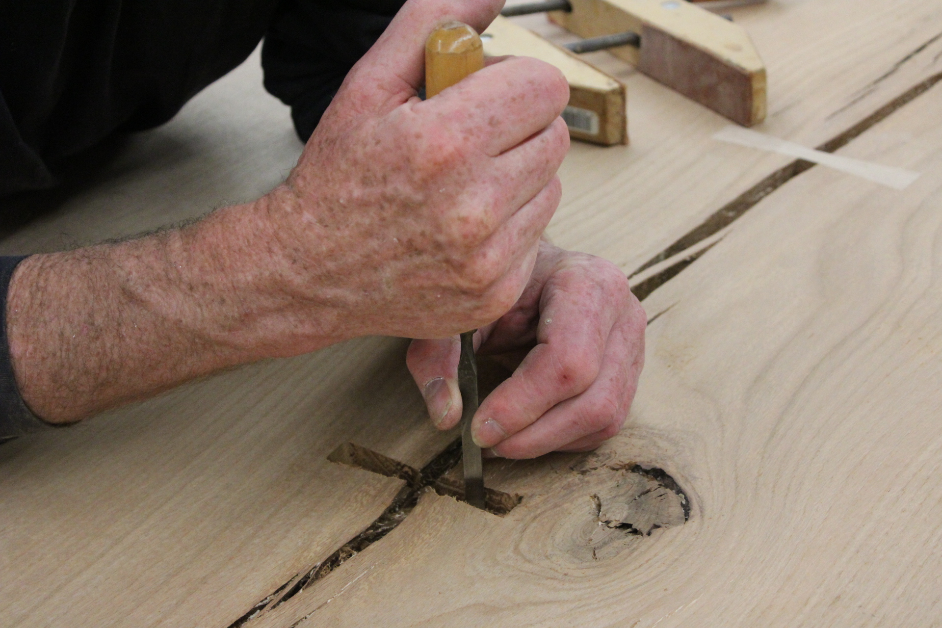 Taking the lead, Andy Moser set out designing the two tables in his workshop. Over the course of five months, he studied the innate character of the oak, allowing the tree to dictate the design. Embracing what many would consider flaws in the wood, Andy celebrated the intricacies of the tree. A sizeable crack threatened to tear the board apart but was masterfully secured with an inlay butterfly joint, keeping that piece of the tree’s story intact for centuries to come.